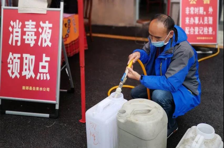 配给的一台工程车,起早贪黑到市区装消毒液,至目前共装回了31吨,被领导和同事亲